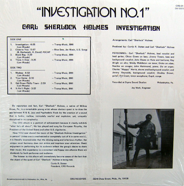The new band–dubbed Carl “Sherlock” Holmes Investigation–released only one album, 1974’s Investigation No.1. The album is a rare, compelling artifact of early 70s experimentalism that merges raw funk energy with spiritual jazz and Afrocentric consciousness.
